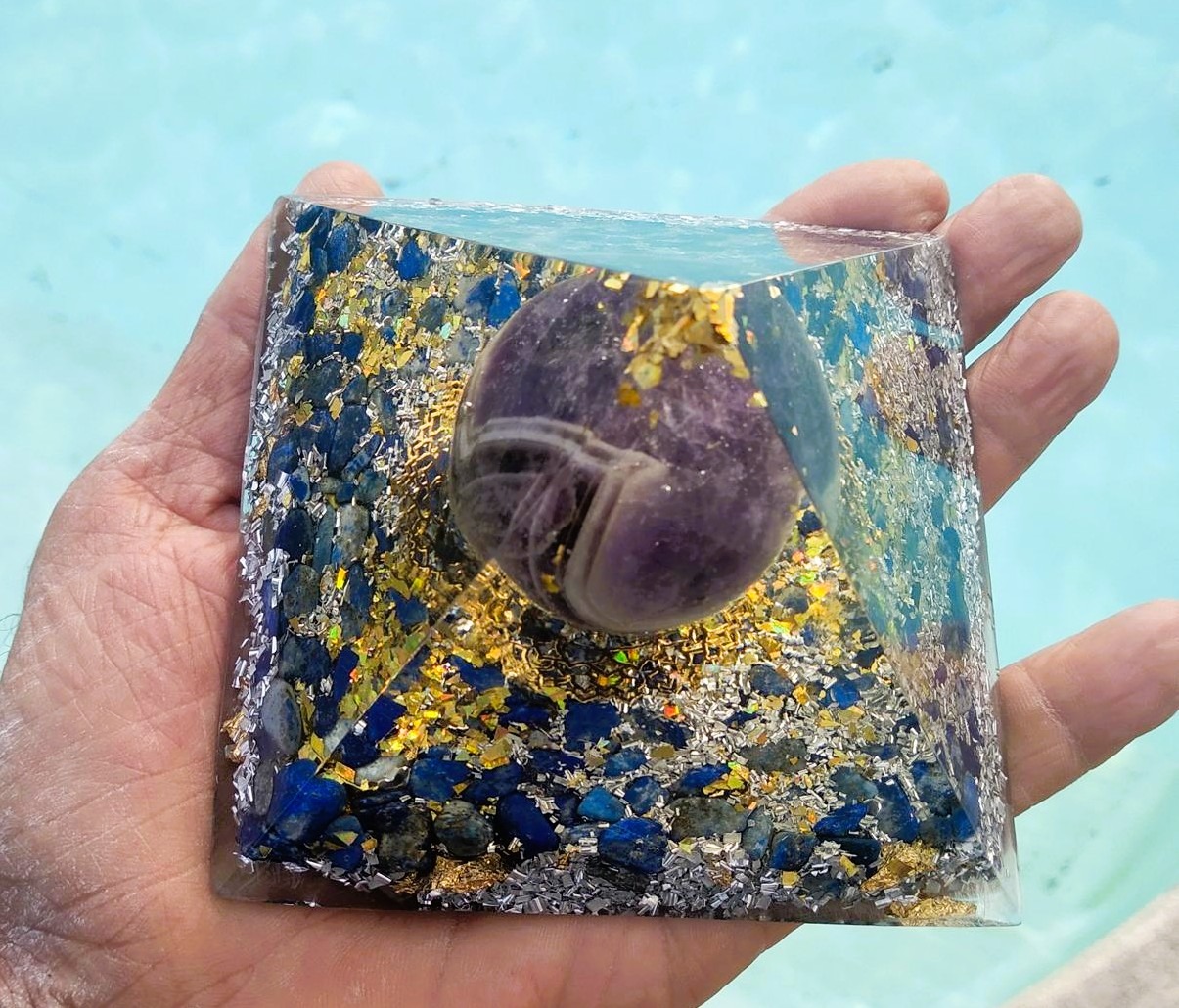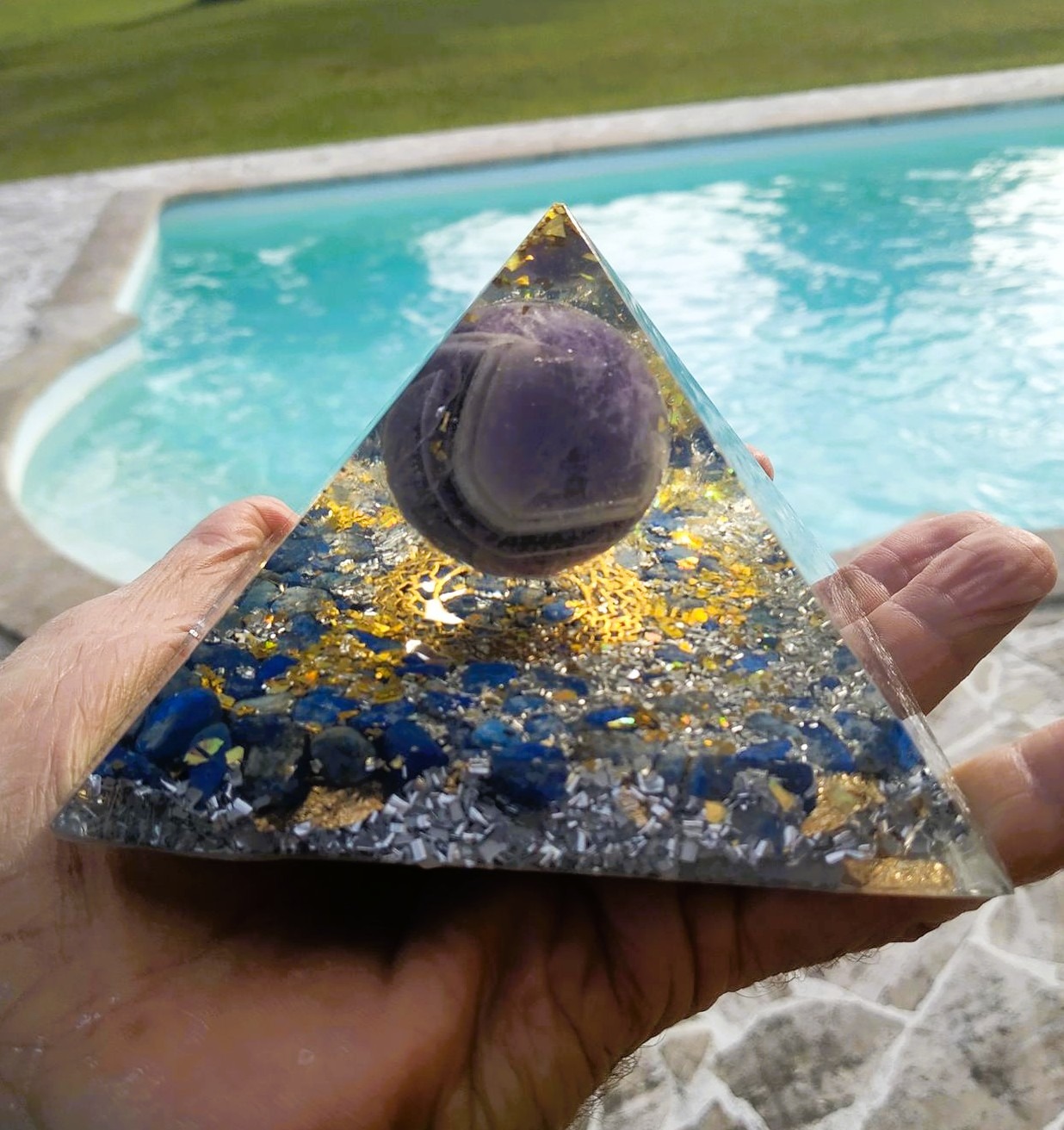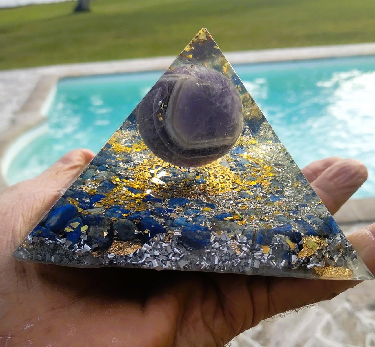 Cette Orgonite pyramide est agrémentée d’ une belle sphère d’Améthyste suspendue au-dessus d’un lit de Lapis Lazuli.