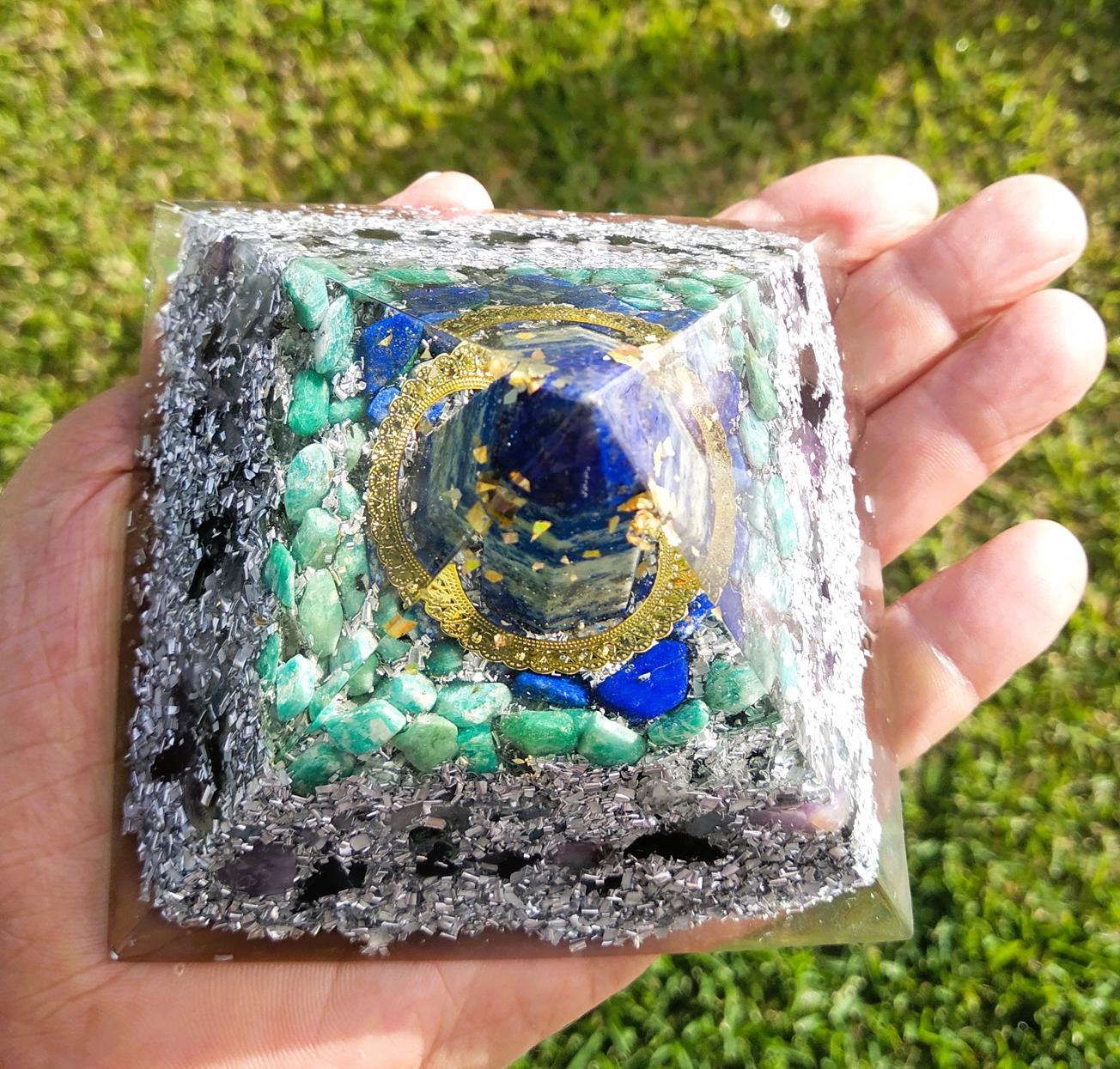 Dans cette orgonite dite Khéops , un obélisque en Lapis Lazuli s’élève au sommet de la pyramide au milieu d’un cercle doré entouré de deux cercles de pierres roulées de Lapis Lazuli et d’Amazonite Verte. La base est constituée de copeaux d’aluminium qui entourent des pierres d’Obsidienne Œil Céleste et de Cristal de Roche