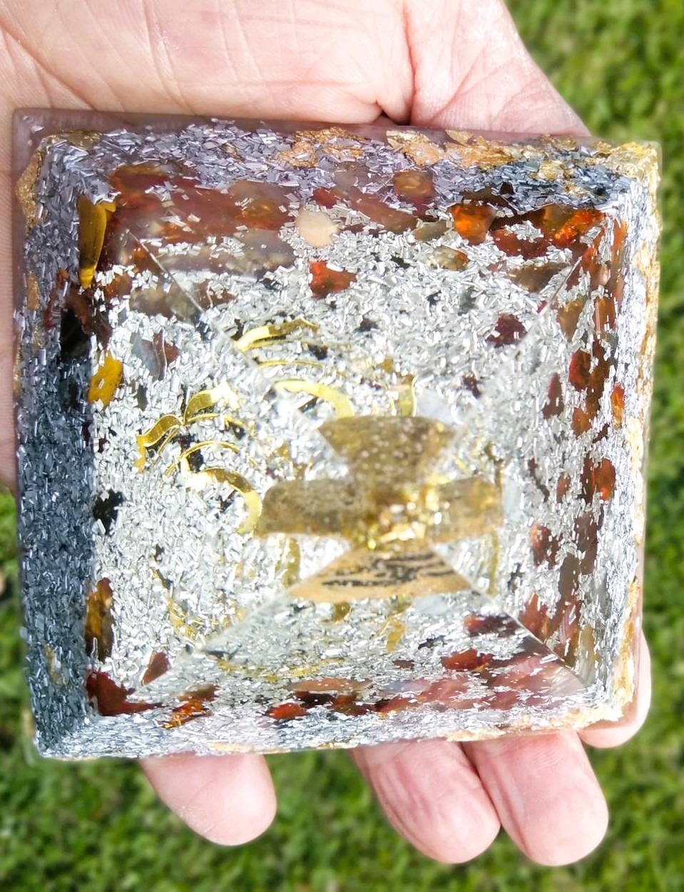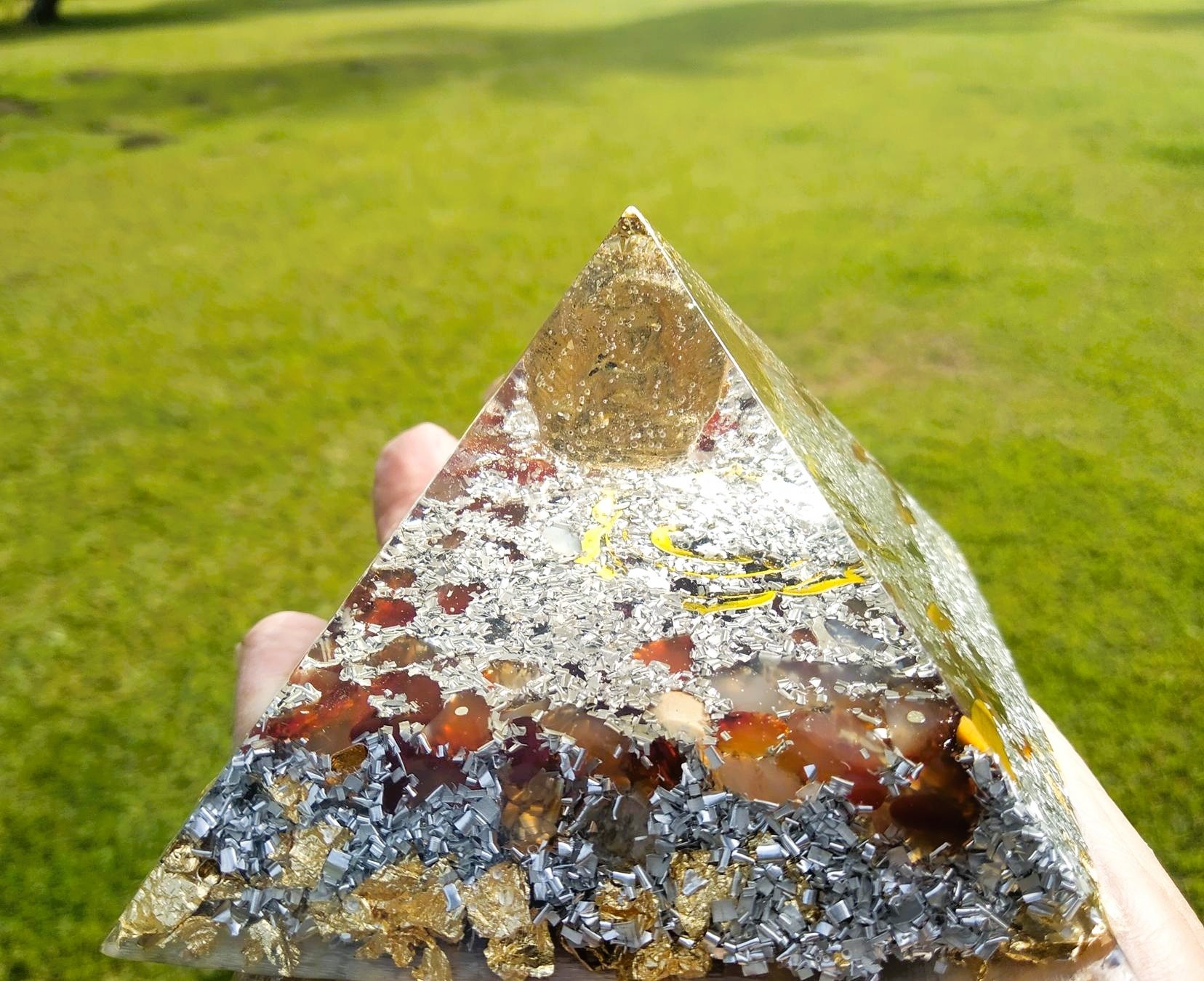 De plus cette orgonite est réalisée à partir d’un moule aux dimensions proches de la pyramide de Khéops, avec toutes ses caractéristiques géométriques particulières en rapport avec la Géométrie sacré (nombre d’or). Vous pouvez en plus, pour renforcer ses vibrations, positionner ses 4 faces en alignement avec les 4 points cardinaux comme l’est la véritable en Egypte.