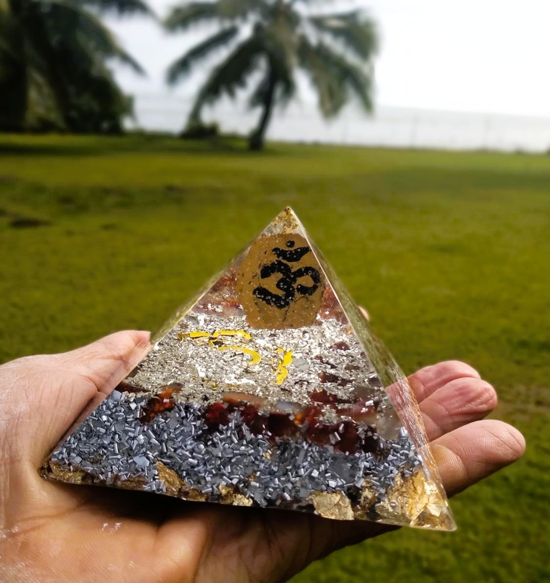 Shakyamuni (le Bouddha historique), représentation en résine fabriquée à partir d’un pendentif en argent fabriqué au Tibet, est suspendu au sommet de cette pyramide orgonite. A l’arrière de la figurine le symbole Om (ou Aum ॐ) symbolise le son primordial, qui est considéré comme le son de l’univers. Il est également associé à la conscience suprême ou à la réalité ultime. De ce fait, suspendu au sommet de la pyramide il incite à la méditation.